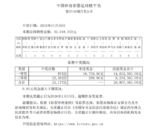 本期兑奖截止日为2026年1月15日,葡萄本期14场销量为32,牙输618,352元,逾期作弃奖处理
